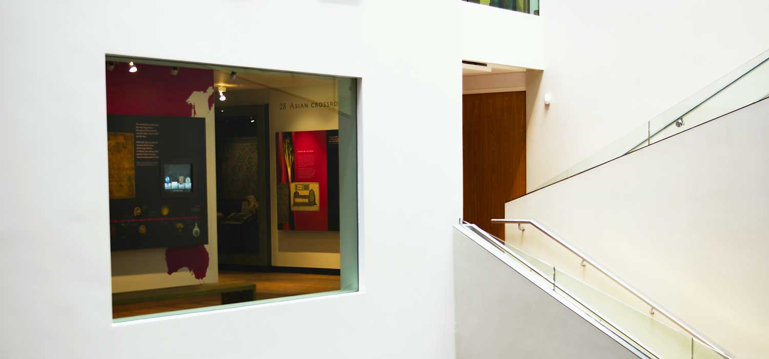 The Orientation Gallery for the first floor explores the transmission of ideas, knowledge, culture and religion through the overland Silk Road and sea trade routes between the Mediterranean and Asia in early modern times. Maps provide information about the routes taken by the early traders while an interactive touch screen explores the themes of trade, innovation and ideas, religion and craftsmanship, and design. These themes are reinforced with wall displays around the gallery.